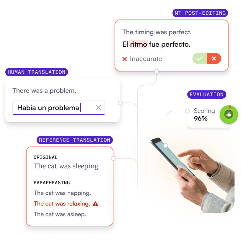 From native-language human translation to automated translation post-editing and multi-method evaluation, Defined.ai delivers machine translation services that help teams build, fine-tune, and train high-quality machine translation and AI translation systems across 100+ language pairs.