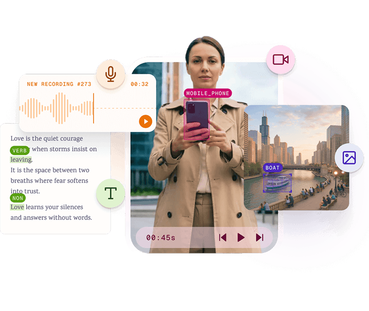 We support annotation for image, audio, text, video, and multimodal datasets, including advanced tasks like semantic segmentation, speaker diarization, and cross-modal linking.