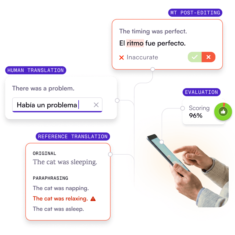 From native-language human translation to automated translation post-editing and multi-method evaluation, Defined.ai delivers machine translation services that help teams build, fine-tune, and train high-quality machine translation and AI translation systems across 100+ language pairs.