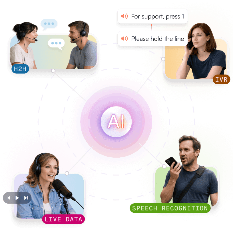 Spontaneous H2H and IVR dialogues, scripted monologues, and live audio from calls, meetings, and podcasts.