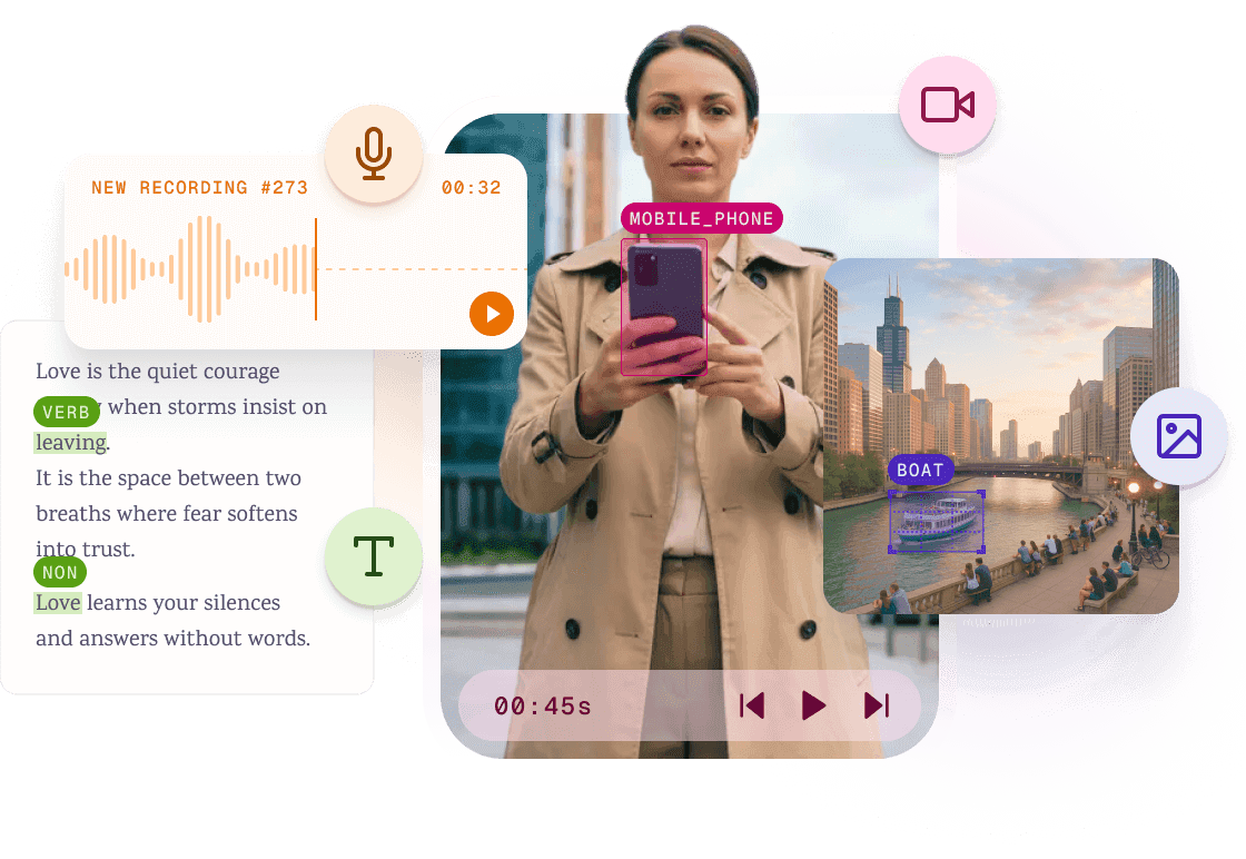 We support annotation for image, audio, text, video, and multimodal datasets, including advanced tasks like semantic segmentation, speaker diarization, and cross-modal linking.